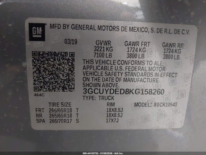 VIN: 3GCUYDED8KG158260