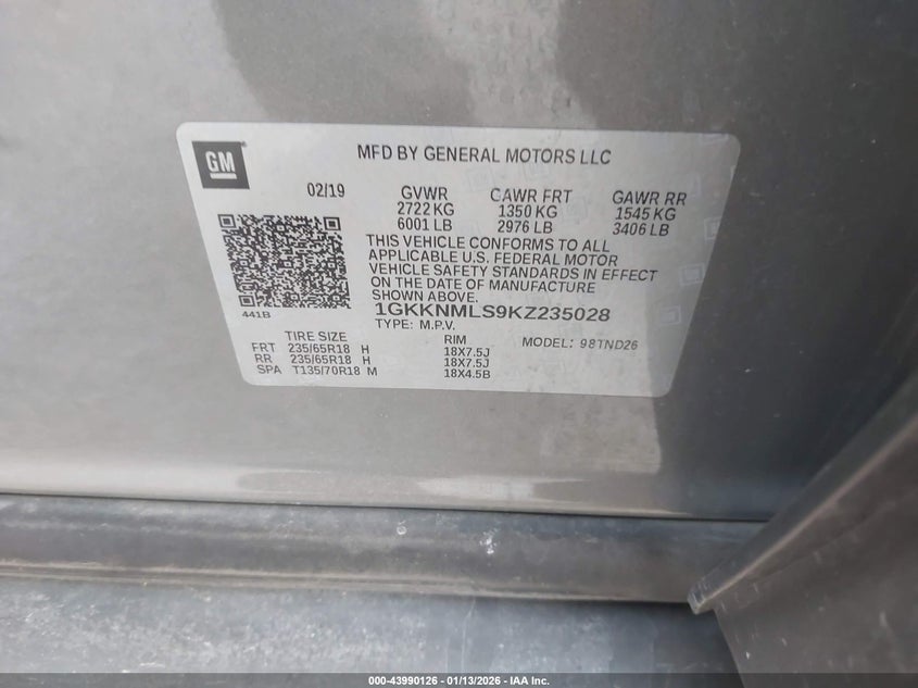 VIN: 1GKKNMLS9KZ235028