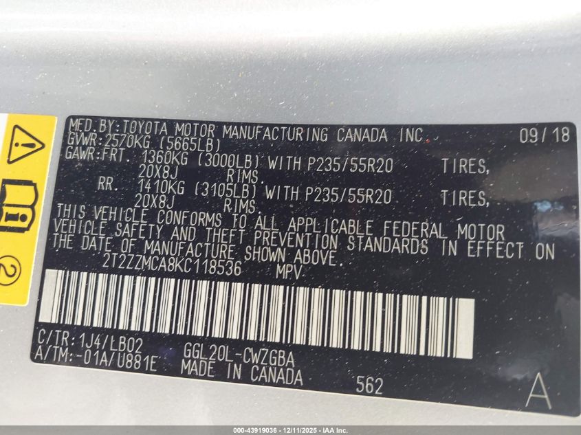VIN: 2T2ZZMCA8KC118536