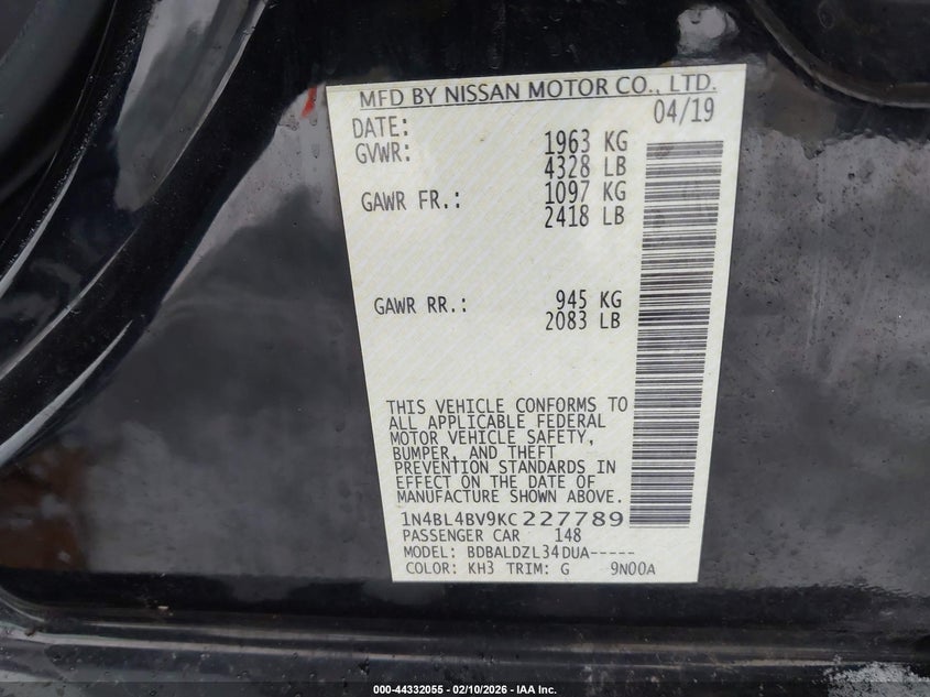 VIN: 1N4BL4BV9KC227789