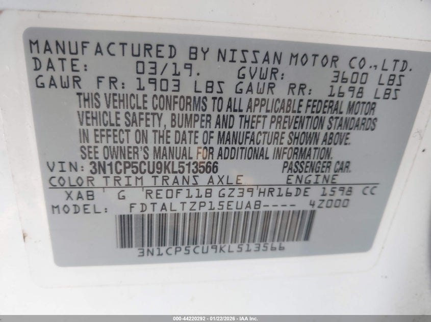 VIN: 3N1CP5CU9KL513566