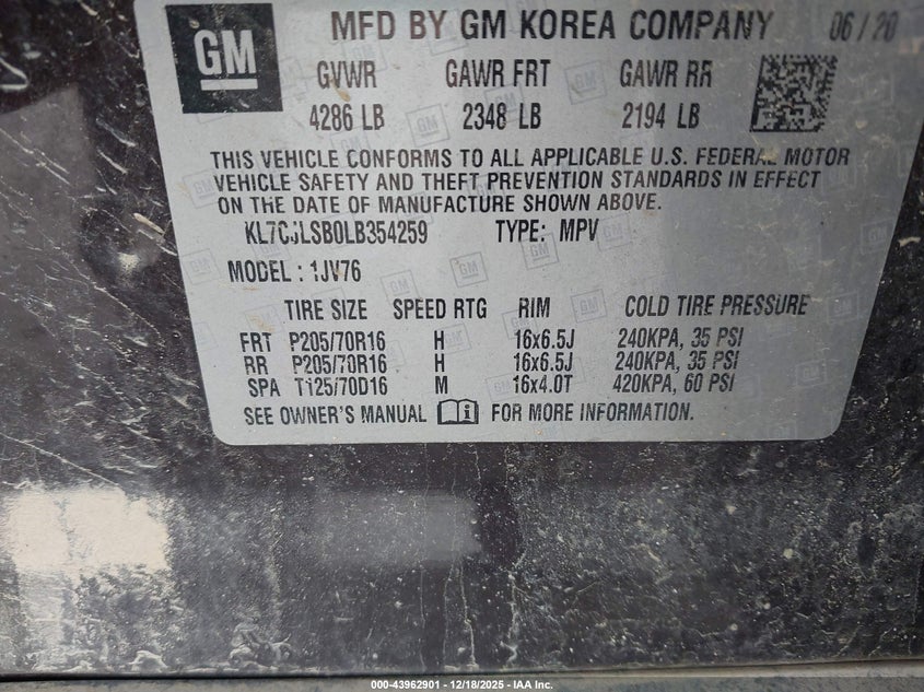 VIN: KL7CJLSB0LB354259
