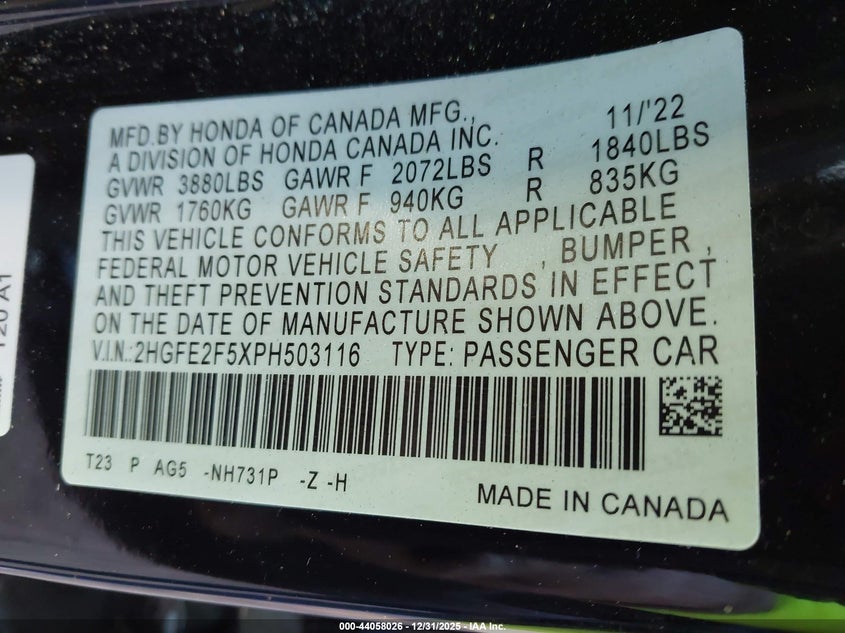VIN: 2HGFE2F5XPH503116