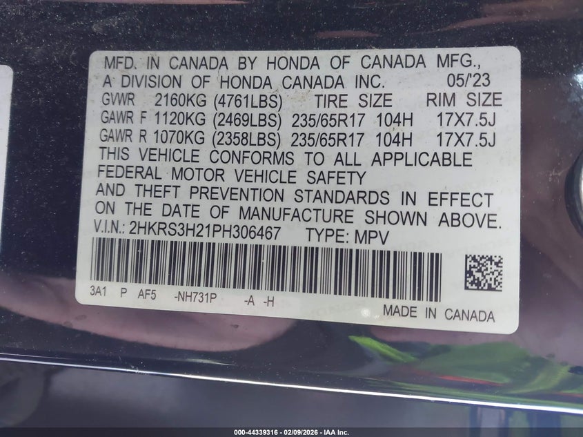 VIN: 2HKRS3H21PH306467