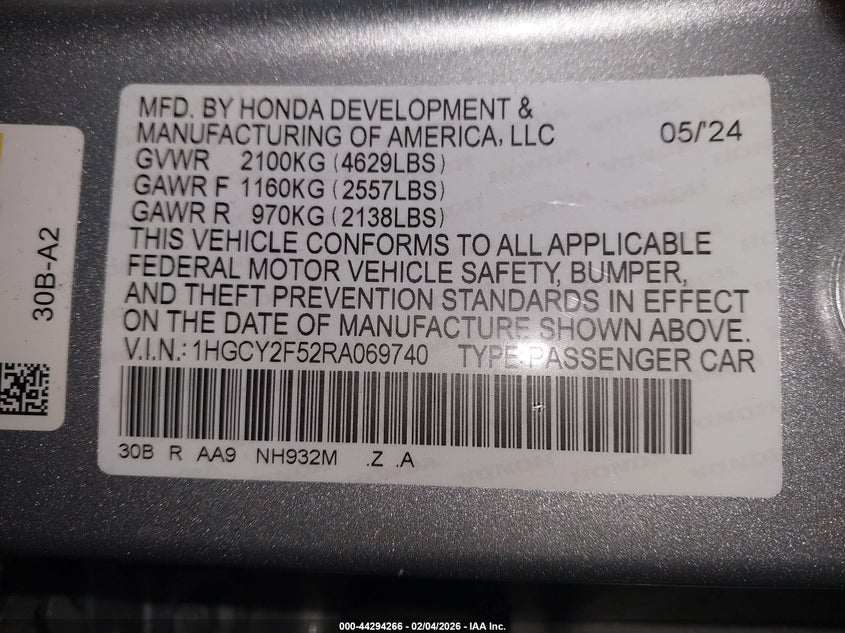 VIN: 1HGCY2F52RA069740
