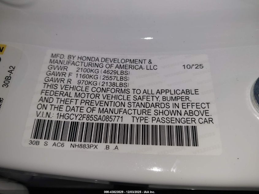 VIN: 1HGCY2F85SA085771