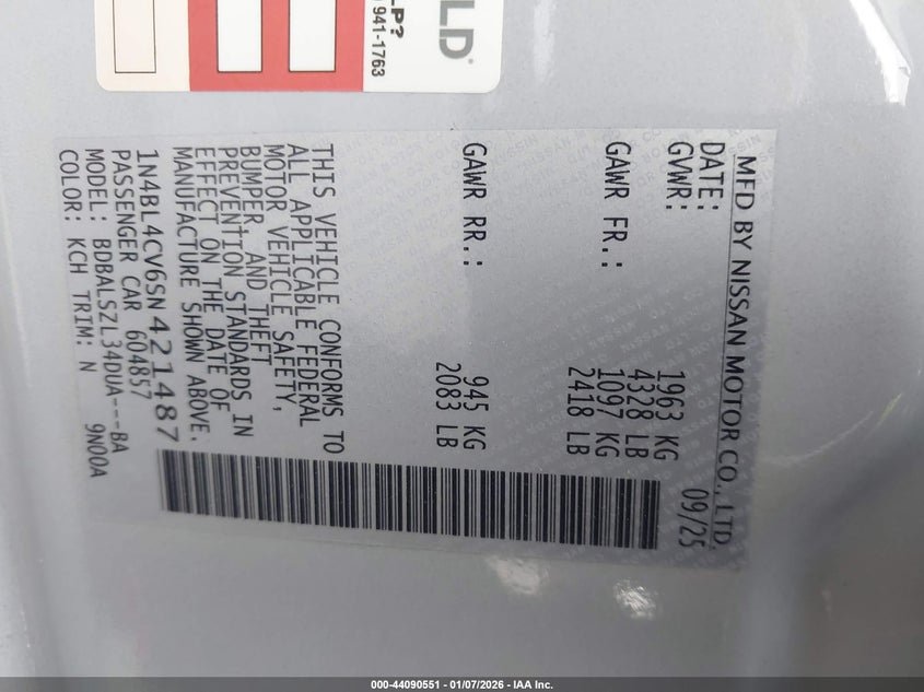 VIN: 1N4BL4CV6SN421487